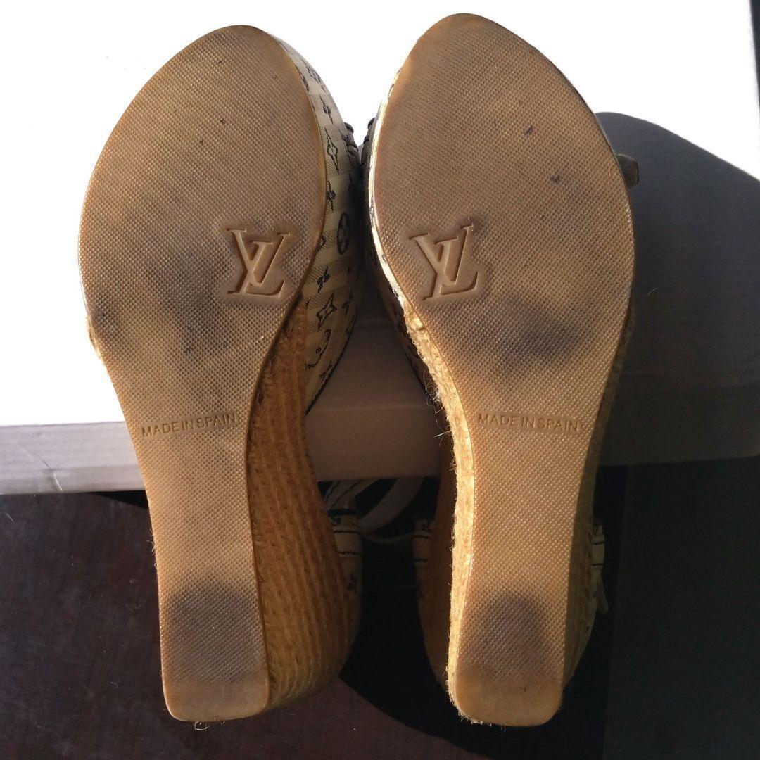 ルイ・ヴィトンらしいモノグラム柄が目を引く、ウェッジサンダルです。カジュアルながらも上品なデザインで、夏のリゾートスタイルや普段使いにも活躍します。
