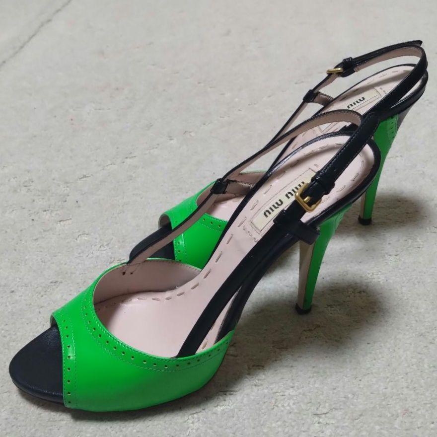 miumiu ミュウミュウのグリーンと黒のストラップ付きサンダルとなります。